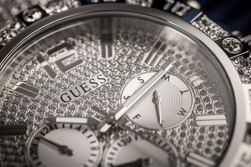 Oltre alle dimensioni, l’orologio brilla di migliaia di cristalli scintillanti, su cui Guess non ha mai lesinato.