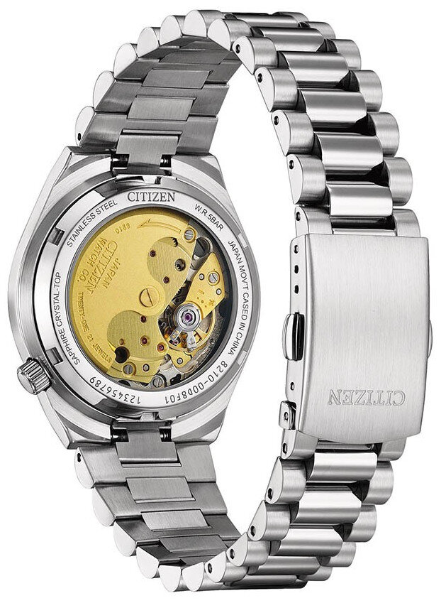 Meccanico a carica automatica. Citizen 8210, Riserva di andamento 45h, 21.600 BPH (3Hz), 21 pietre