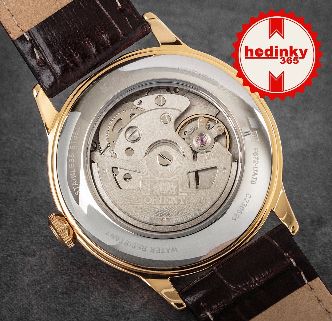 Meccanico a carica automatica. Orient F6724, Riserva di andamento 40h, 21.600 BPH (3Hz), 22 pietre, Hacking, Possibilità di carico manuale