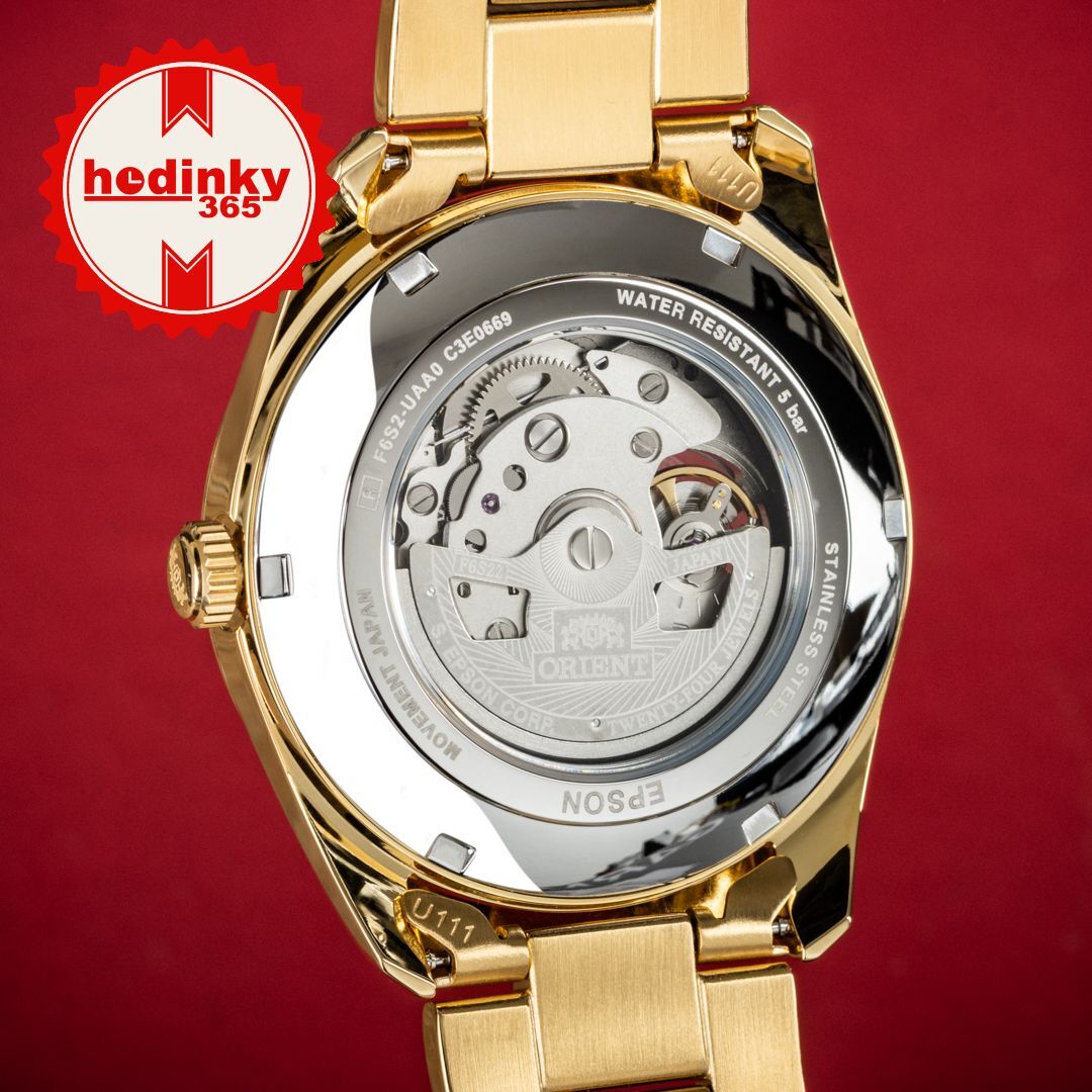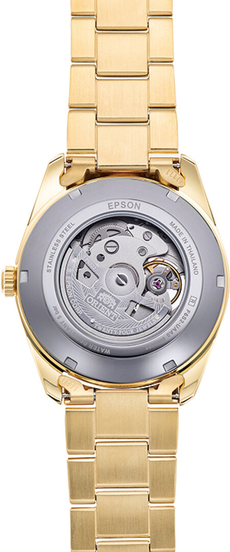 Meccanico a carica automatica. Orient F6S22, Riserva di andamento 40h, 21.600 BPH (3Hz), 24 pietre